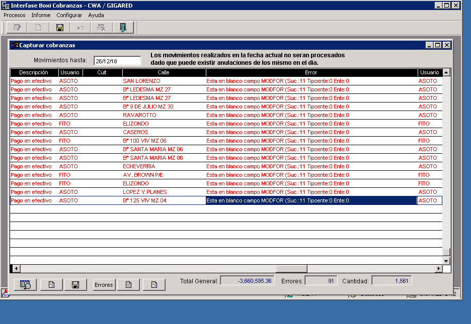 Este error se graba en la interfaz, pero no se sube a CWA.