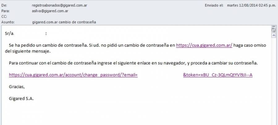 Luego nos llegara un mail con esta estructura para cambiar la password. Nos incluirá un link que debemos hace doble click para confirmar el cambio y nos permitirá cargara la nueva password.